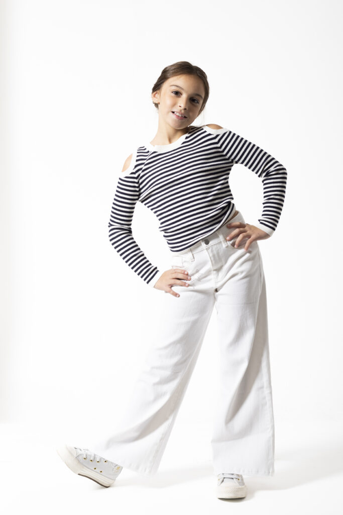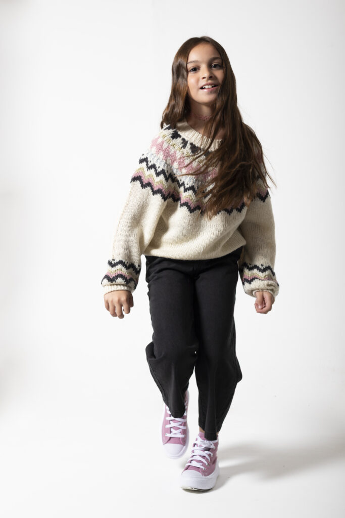 Entre las piezas más aplaudidas se encuentran los jerséis a rayas con cut en los hombros y los de animal print, que aportan ese guiño divertido y sofisticado que define la nueva moda infantil. Cada prenda, cuidadosamente confeccionada, equilibra comodidad y tendencia, pensando en niñas activas que disfrutan jugando… pero también marcando estilo.