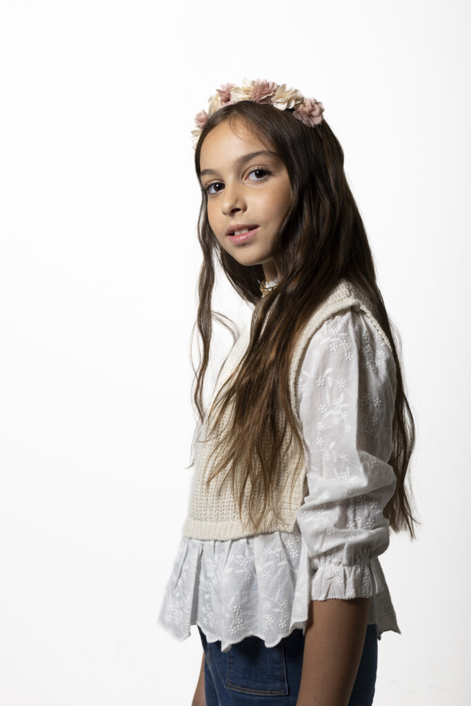 Con su sonrisa espontánea y su porte natural, Mireia se convierte en el alma de esta producción. Su talento y desparpajo ante la cámara la posicionan como una de las jóvenes promesas más destacadas del panorama infantil. En cada fotografía transmite la alegría y la autenticidad que definen la infancia, pero con una elegancia innata que cautiva.